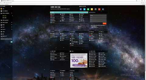 토렌트 사이트 모음 http://torrent.cox.krTV 사이트 http://tv.cox.kr핫딜 정보 http://hotdeal.cox.kr유머 모음 http://humor.cox.kr뉴스 모음 http://news.cox.kr무료 폰트 정보 http://font.cox.kr무료 이미지 정보 http://image.cox.kr자료실 모음 http://software.cox.kr그외 공개 시작페이지 모음 : http://rank.cox.kr