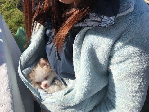 첫 캠핑이라 그런지, 강아지가 왠지 감기에 걸린 것 같은 느낌도 들어서 어제는 난방 온도도 조금 높여서 잤어요. 아침에 빗질도 이쁘게 해주고 밥도 많이 주니까 다시 포미가 생기있어졌습니다.