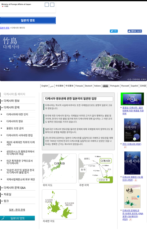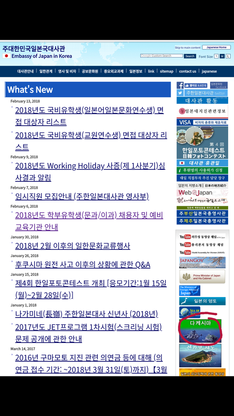 경시대회 찾느라 주한일본 대사관 홈페이지에 들어갔는데 다케시마라는 글이 있어서 눌렀더니 정말로 다케시마를 일본땅이라고 주장하고