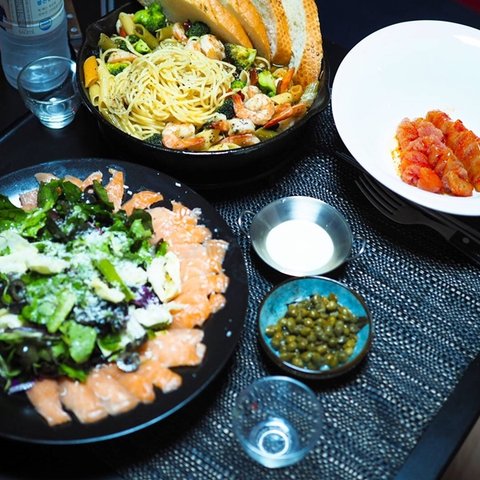 2. 감바스&연어샐러드&명란젓친구넘과 각각 요리 하나씩 하기로하고 저는 감바스를, 친구는 연어샐러드를 했고 명란젓은 그냥 썰어서 참기름만 넉넉히 뿌렸는데 이게 또 기가막히더라구요~ 중독성있는 맛입니다.나름 생선이고 해서 화이트와인 따서 첫잔먹어보고 친구넘과 눈빛교환 후 빛의 속도로 소주셋팅을 하였습니다ㅋㅋㅋ