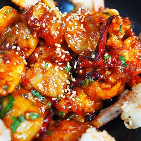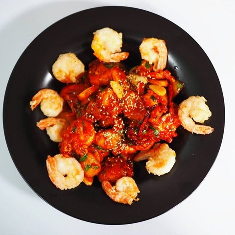 9. 새우튀김매운족발소스가 남아서 어떻게 처리할까 하다 만든요리입니다. 새우를 전분반죽에 튀겨서 양념에 볶아주면 끝, 찍먹을 위해 볶지 않은 새우도 얹어줍니다. 튀김이야 뭐... 맛없기가 힘들지 않겠습니까ㅋㅋㅋ 소스가 별로 맵지 않아서 태국고추를 추가해줬습니다.