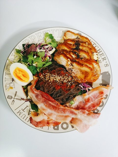 10. 막국수이것도 남은재료 처리를 위한 요리입니다. 족발을 많이 먹었더니 좀 남아서... 당분간 족발은 좀 휴식을 해야겠습니다. 막국수와 소스도 제품인데 나름 먹을만 하더라구요. 허전함을 감추기위한 베이컨과 달걀까지ㅋㅋㅋ