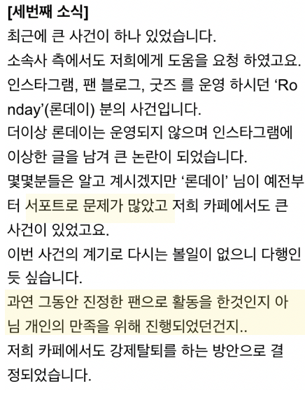예전부터 팬카페에서 논란이 많았다는게 아마 그거와 관련이 있지 않을까. 확신할수는 없지만 논란이 많았던건 분명.