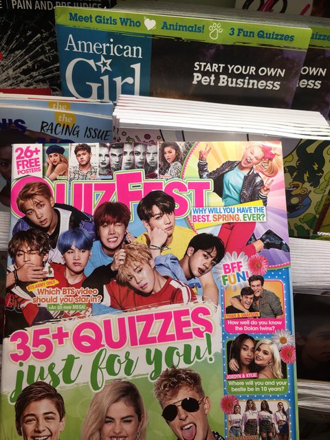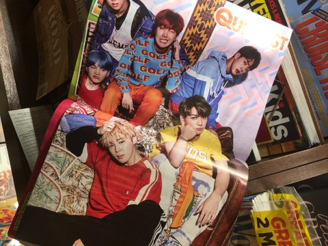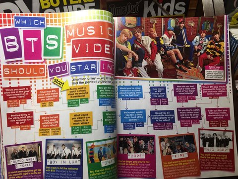 여기서 나오는 타블로이드잡지(시간떼우기용/초딩타겟) 에 방탄이 빵빵 터지고 있어. 내가 지금 웰케 흥분했냐면 이게바로 현재 피부로 와닿는 실세(?)를 보여주거든. 지금 방탄 인기가 여기있는 머글들(?)까지 내려왔다는거지..... 이거 정말 레알임. 저스틴 비버도, 와이돈위도 그렇고....급식이 미래다 급식이 미래야.....이미지 첨부한건 지금 반즈앤 노벨에 풀린 잡지.