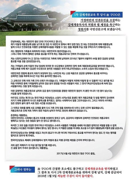 이미 2016년도에 한 차례 다른 교단에서 신앙을 한다는 이유로강제개종교육을 받았으며, 그 인권유린의 현장에서 겪은 충격으로다시는 피해자가 발생하지 않기를 바라는 마음을 담아,강제개종목사의 처벌과 종교 차별 금지법을 제정해 달라는 글을 올렸습니다.