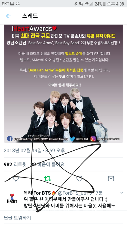 국내 아미들도 더 참여해야 겠지만 외랑둥이 투표율좀 쫌더 끌어 올리면 좋을듯한데 우리 목표는 압도적인 표차이로 이기는 거라는거ㅜ다들 잊지 않았지?ㅠ
