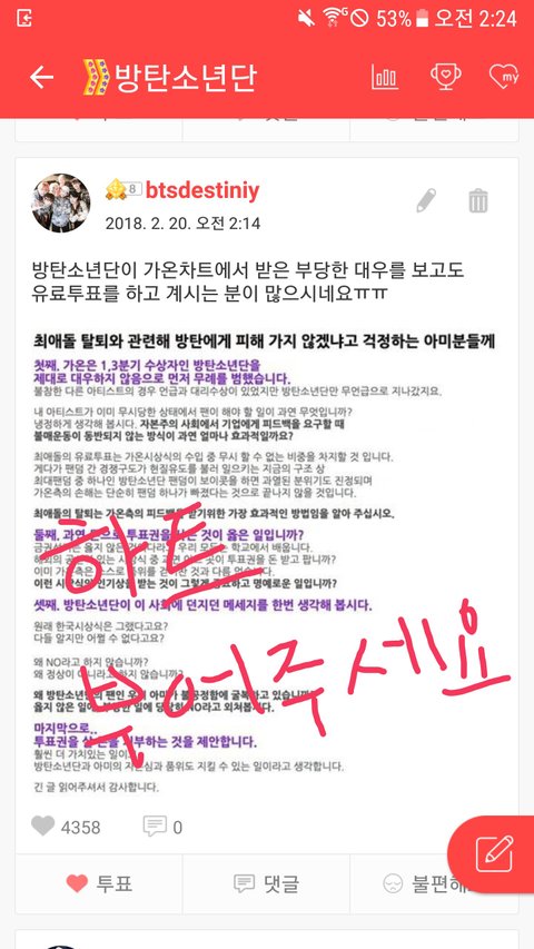 아직 투표하는 아미들 많더라ㅠㅠㅠ 내가 글쓰고 남은 하트 좀 부어서 인기글 올라갔는데 아직 탈퇴안한 이삐들 있으면 하트 좀 부어줘 같이 탈퇴하자고 말하는 이삐들 많이 봤는데 수고가 많아 아이핱 꼭 2관왕 하자 화이팅!! 잘자~❤️