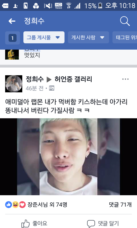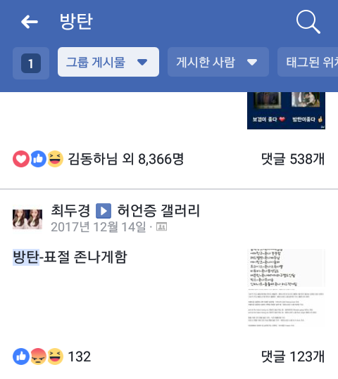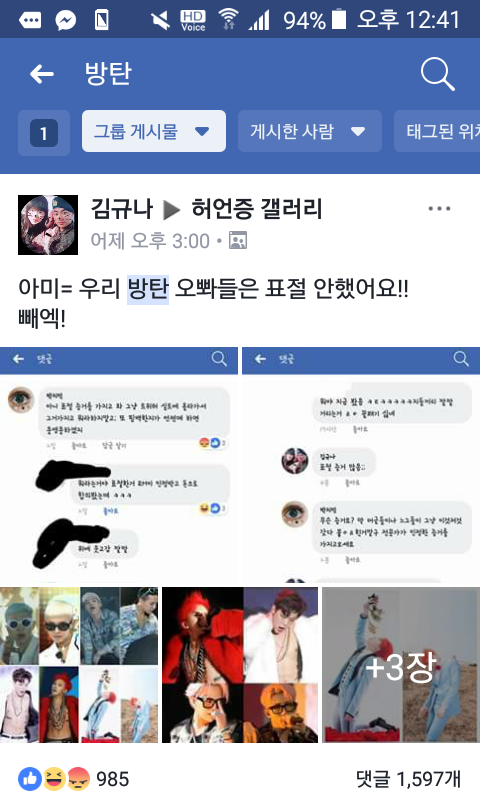 팬톡 이삐로 바꿔야하면 말해줘!! 페x스북 허언증갤러리 그룹에 지속적으로 비교글, 까글, 성희롱글이 너무 많이 올라와 특희 정x수 분은 지속적으로 올리시고 (아미,암이가 아니라 에미다. 방탄 쉴드글 올린 사람 글 캡쳐해서 에미겨나와라 등등) 페이스북은 어플이라서 어떻게 피디엪 따는지 모르겠어ㅠㅠ 도와줘