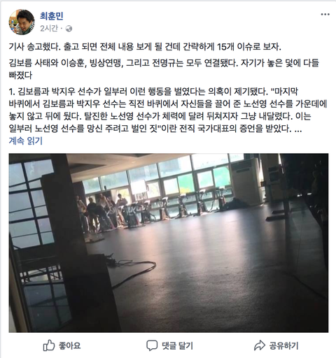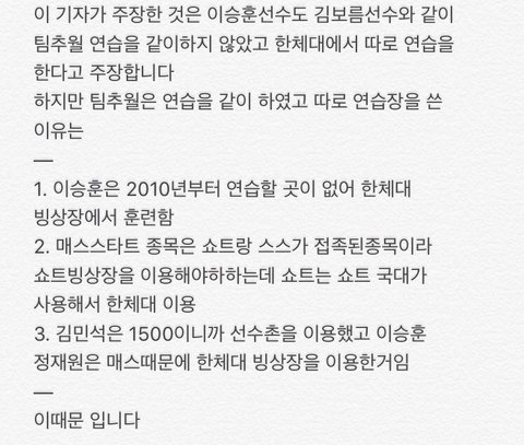 전명규 부회장은 지난 기사가 나가자 지우라며 여러 차례 내게 말했다. 이제까지 성과가 있으시니 이승훈 등 다른 건도 있는데 이 정도로 쓴 거라 말했었다. 그는 변호사 거쳐 소송 걸겠다고 내게 협박했다. 아파서 휴직 중인 내게.