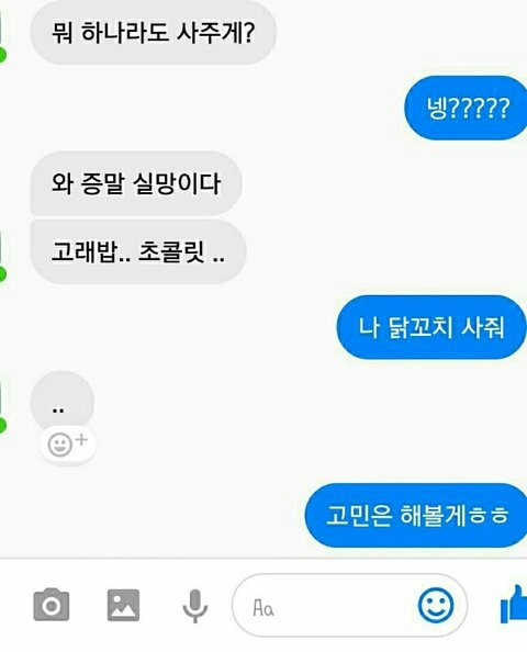 근데 얘가 전에도 그렇고 나를 호구로 보는거 같아 학교에서 어디가면 나 맛있는거 사줄거지? 이러는데 ㅋㅋㅋㅋ 진짜 한두번이 아니라서 기분 나쁜데 내 성격이 찌질해서 그러지말라고 얘기를 못하겠음 진짜 얘들아 답 좀 줘라 어떻게 해야되냐 정 뚝 떨어진다 단어 이야기는 내가 영어단어 써야지 엄마가 용돈 주고 해서 그런거임 고래밥 초콜릿은 겨울방학 하기 하루 전날 학교에서 얘 관련 병크 엄청 크게 터지고 반학기 동안 같이 다녀줘서 고맙다고 지가 준거임 ㅅㅂㅋㅋㅋㅋㅋ