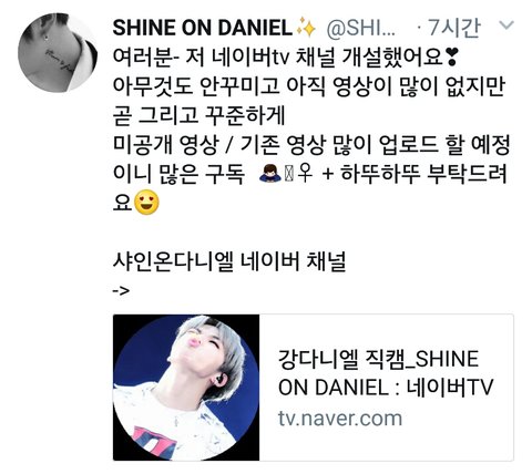 http://m.tv.naver.com/shineondaniel 네캐채널 만들었다고 올라왔더라 영상 많이 올려주면 좋겠ㅋㅋㅋㅋㅋ