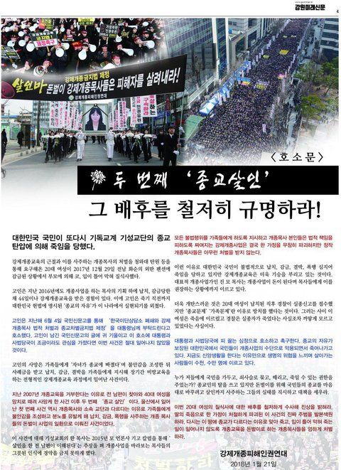 그 결과 지난 1월 광주에서 개종교육을 받던 구양은 질식사로 인해 사망을하였습니다.특히 그녀는 생전에 1차로 강제개종을 당한 후에 국민신문고에 청원서를 올릴 정도로 당찬 여성이었는데요.허나 그녀의 호소문에도 어떠한 가시적인 조취도 취해지지 않았습니다.이에 그녀는 또 다시 가족들에 의해 납치되어 개종을 받던 중 싸늘한 시신이 되어 돌아왔는데요.그녀가 호소한 내용이 받아들여졌다면 이러한 사망사건도 없었을 텐데...부모의 입장에서 바라보면 얼마나 마음이 아플까요??