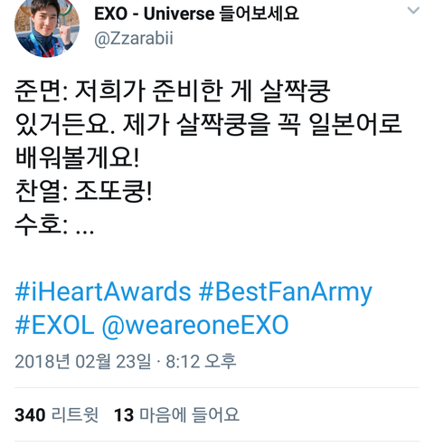 앞으로 엑소엘의 살짝쿵은 조또쿵으로 바뀝니다. ex)벽에 실짝쿵 부딪히다X 벽에 조또쿵 부딪히다O