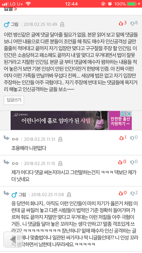 이분 동일인물 같은데 계속 지속적으로 인격모욕 하시고 인신공격하시네요