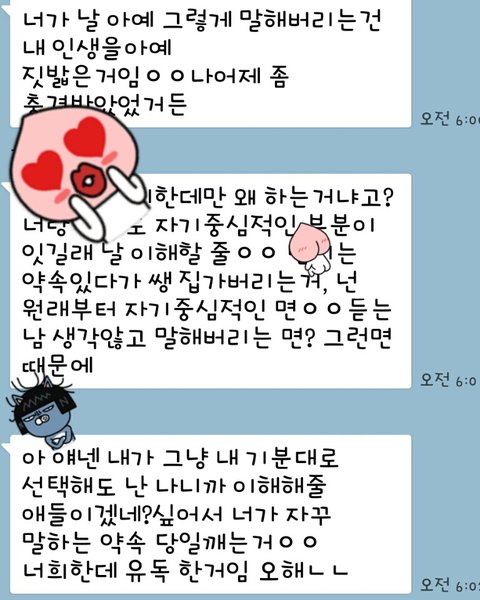 5. 이 친구가 약속을 잘 안지키는게 힘들었던 저는 얘기를 했어요. 이렇게 하는거 좀 아닌거 같다. 적어도 전날에 연락을 해주면 안되냐. 그랬더니 "나는 약속에는 같이보내는 시간도 포함된다고 생각해. 너랑 b랑 나랑 만나면 맨날 너희는 오후8시만되면 집으로 가잖아. 나는 더 놀고싶은데, 나는 그거나 당일날 약속 깨는거나 같다고 생각해, 니가 원래 이기적인 성향이니까 난 니가 나를 이해할 줄 알았지"랬어요. 근데 저랑 B는 집이 타지라서 기차타고 가야해서 어쩔 수 없이 저녁 11시까지 집에 도착하려면 8시에는 헤어져야 하는 거예요.....