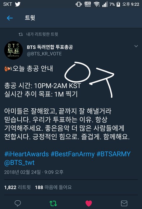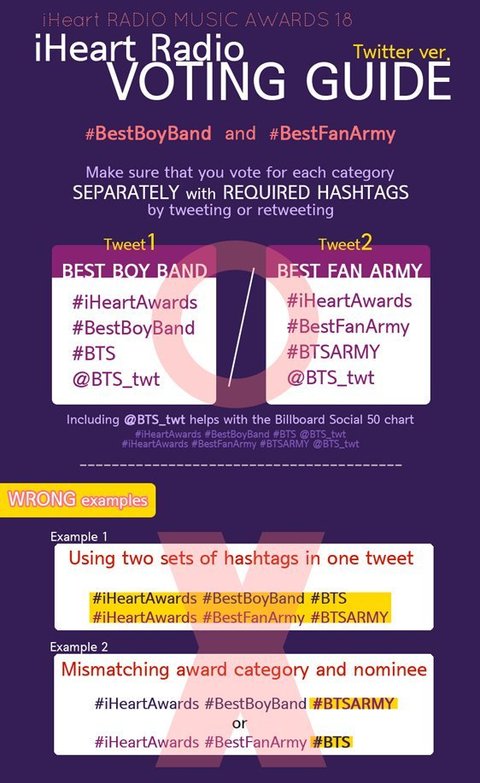 이삐들 우리가 하는것도 중요하지만 잘못된 해시태그 무효표 이걸 잡이야돼. #BTS #BTSARMY 이거 동시에 검색하면 겁나 많이 나오거든..ㅜㅜ?? 최신꺼봐바 많아 답멘으로 사진첨부해서 알려줘..!! 외랑둥이면 이거 복붙해. hi ARMY~? this us correct hashtage. ➡️#iHeartAwards #BestFanArmy #BTSARMY @BTS_twt Do not use hashtag both #/BTS and #/BTSARMY. Separate it please. Thank you♡ (사진첨부)