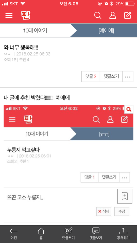 내가 추천 박혀서 좋아하는 글 올리니까 댓글도 달아주고 추천도 막 눌러줬어 ❤️❤️❤️❤️❤️