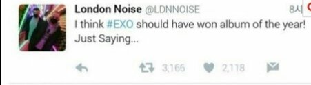 어떻게 까도까도 나오냐?ㅋㅋㅋㅋㅋㅋ런던 노이즈라고 또 SM프로듀서인데 방탄이 받은 '올해의 앨범상'이 엑소에게 가야한다는 트윗임 진짜 이쯤되면 견제 오지게 하는거 맞잖아ㅋㅋㅋㅋㅋㅋㅋㅋㅋㅋㅋㅋ