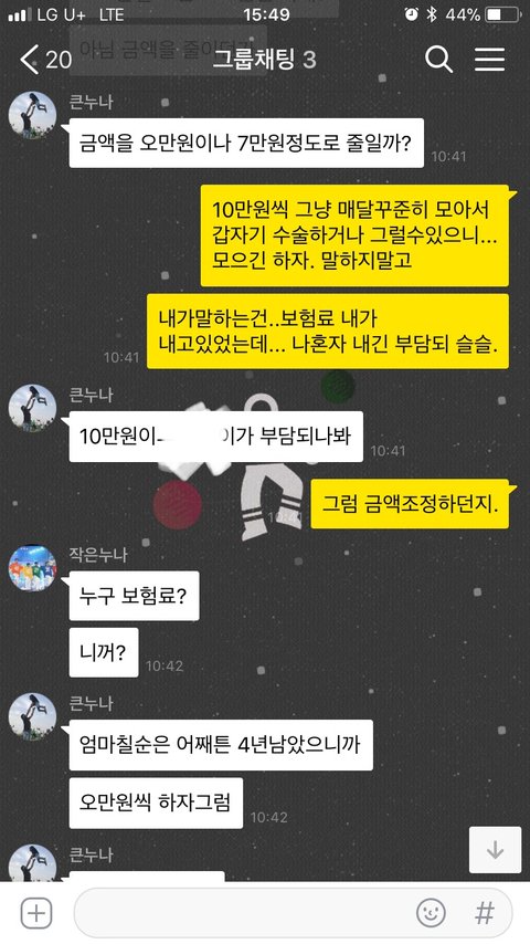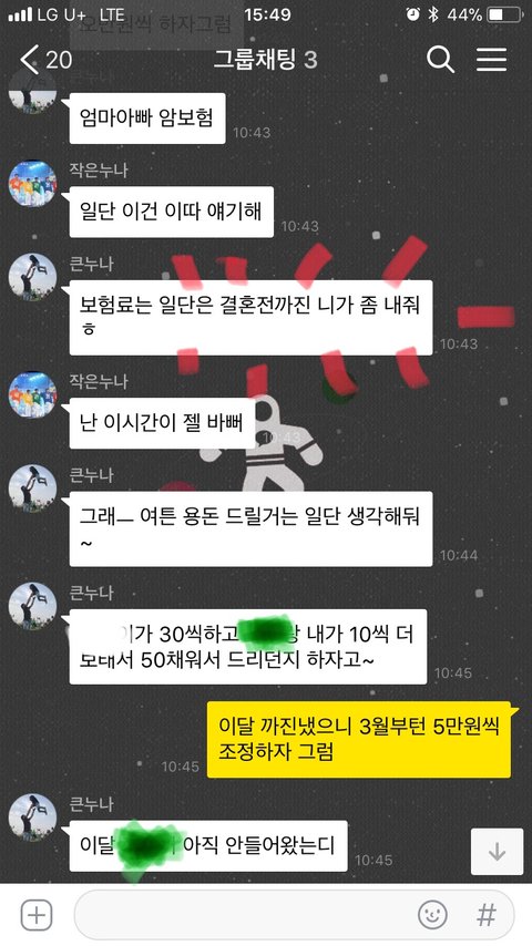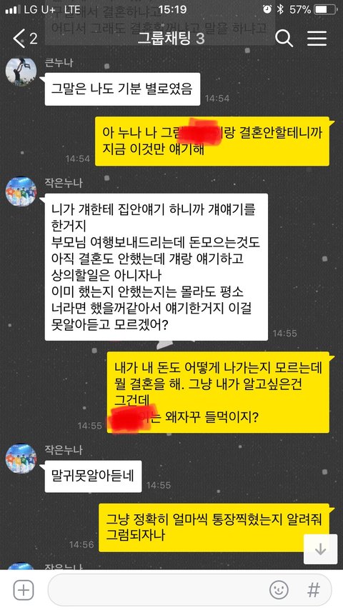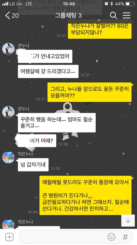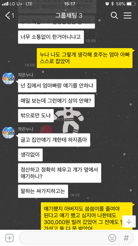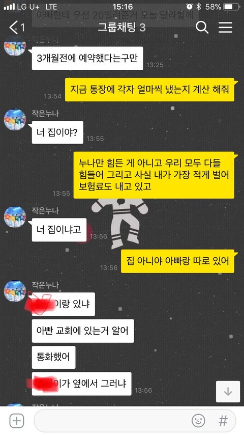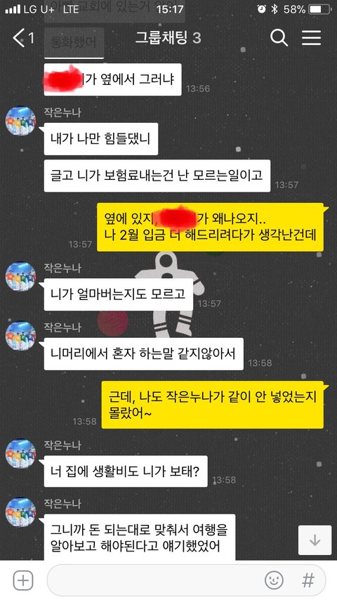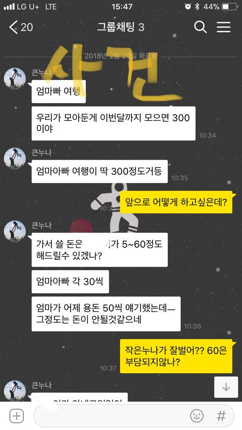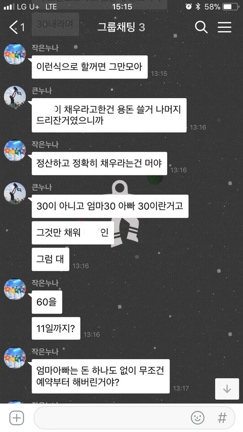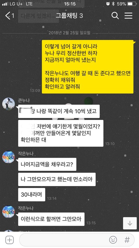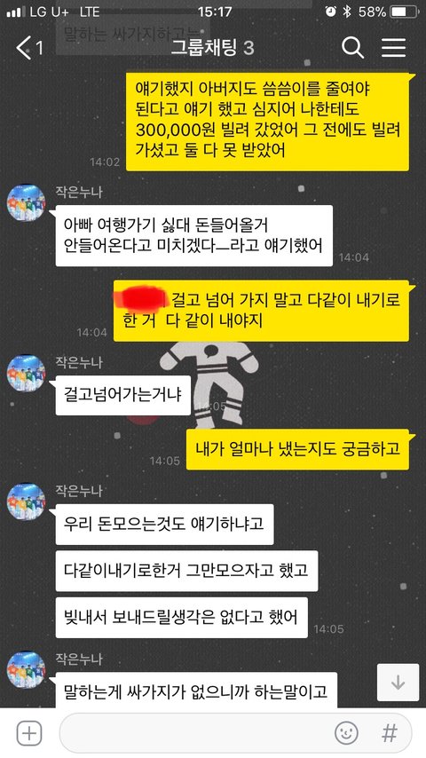 여행경비가 부족함 큰누나가 각자에게 더 내라함