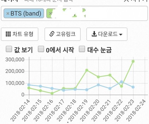 클릭한 이삐들은 링크별로 한번씩 다섯번씩만 눌러주고 나가줘. 눌러서 스크롤 쭉 내리고 나오면 돼여. 혹시 모르니 나오기 전에 10까지 세주면 더 좋고. 요며칠 데이터 안올라와서 BTS(band)로 검색한 추이야. 보여???? 이삐들 부탁해 ㅠㅠ