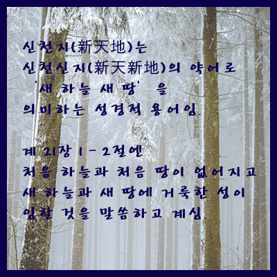 성경의 '새 하늘과 새 땅' 곧 '신천신지(新天新地)' 를 요약한 것이 '신천지'이며 '예수교'는 예수가 교주(敎主 : 교회의 주인)임을 의미하고 '증거장막' 이란 계시록이 이루어진 실상을 보고 듣고 증거 하는 장막을 뜻하며 '성전(聖殿)'은 하나님을 모시고 예배드리는 거룩한 집을 뜻합니다.