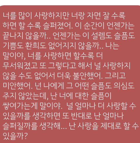 정말 평범하게 아무런 트러블 없이 연애 해온 2년차 커플입니다. 저는 제 첫사랑인 여자친구를 진심으로 사랑했고 표현했지만 여자친구는 항상 웃고있는데 슬픈 얼굴로 저를 보았어요. 그리고 어느날 톡을 하는데 이렇게 왔습니다. 그리고 헤어지자고 하더군요. 톡을 읽어도 읽어도 이해가 가질 않습니다. 여자친구의 마음을요. 저는 뭐라고 말해야 할까요.