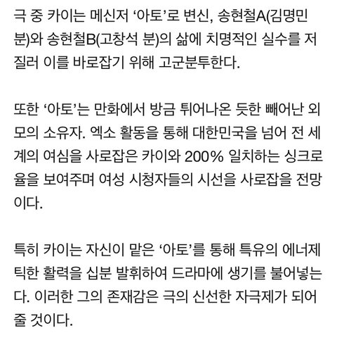 어제 무대 열기로 미치기 직전인데 바로 차기작 소식이라뇨..종인아 살려조...ㅂㅇㅂ 작가님도 유명한 작가님이고 역할도 요정(메신저)라 기대 된다 ❤️
