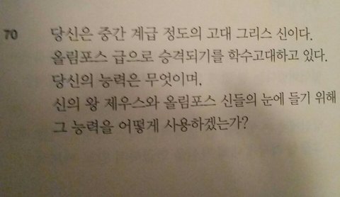 ★ 당신은 중간 계급 정도의 고대 그리스 신이다. 올림포스 급으로 승격되기를 학수고대하고 있다. 당신의 능력은 무엇이며, 신의 왕 제우스와 올림포스 신들의 눈에 들기 위해 그 능력을 어떻게 사용하는가?