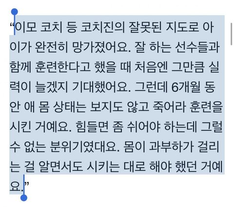 스케이트맘 C씨는 “이런 식이면 누가 열심히 하고 싶은 마음이 들겠어요. 아무도 탱크 안 하려고 해요. 그나마 힘 없는 어린 선수한테 ‘다음에는 널 밀어주겠다’는 미끼를 주고 희생양이 되기를 강요하고 있는 거예요”라고 말했다.