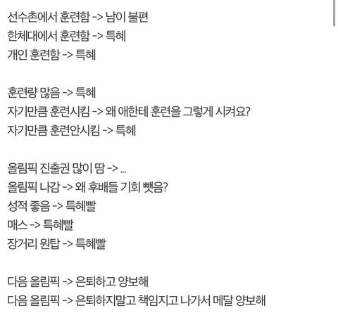 B씨는 “매스스타트는 분명히 개인 종목이예요. 팀플레이가 필요하다면 왜 어린 선수들만 탱크 역할을 해야 하나요? 이승훈은 혼자서도 충분히 메달을 딸 수 있는 실력 있는 선수예요. 후배들을 위해서 16바퀴 중에 2~3바퀴를 앞에서 끌어줄 수 있다고요. 그러면 후배도 같이 메달 딸 수 있는 거잖아요. 이번 매스스타트에서 페이스메이커를 자처한 네덜란드 스벤 크라머처럼요. 어떻게 한 사람을 위해 나머지가 희생하는 전략이 팀을 위한 거라고 할 수 있나요? 금메달은 나눠 가질 수 있는 게 아니잖아요”라고 말했다.