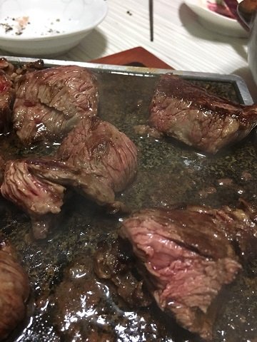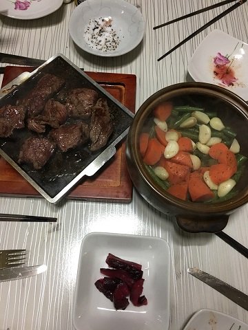 철판에 구운뒤에 달군 돌판으로 옮겨 놓고 따끈함을 유지 하면서 먹습니다 식어버린 고기는 맛이 정말 없거든요,나는 미원을 살짝 뿌리고 고기를 구워요풍풍미가 아주 좋아집니다.(이건 저만의 노하우예요) 뚝배기를 이용하여 더운 야채를 먹기 좋게 유지시키고요 ~~~~~~