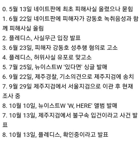 이게 정말 옳은 일이라고 생각해? 미투 운동이 진행되는 지금, 다른 공인들은 '성추행 혐의' 만으로도 자숙을 하거나 피드백을 냈어. 하지만 동호는 아무 피드백도 하지 않은 채로 활동을 지속했지. 플레디스 마저 이 모든 것을 '너그럽게 봐달라'는 말로 끝내려고 했어. 심지어 '기소의견으로 송치' 된 멤버인데.그게 말이나 되는건가? 하지만 뉴이스트 팬덤 대다수는 강동호 사건과 미투운동을 분리해서 생각하는 것 같아. 본질적인 내용은 같은데, 강동호 활동은 지지하면서 미투운동도 응원하는 팬들이 종종 보이곤 해. 강동호의 활동과 뉴블 단체 활동을 팬덤 대다수가 참여해서 반대해줘야 하는데 대부분의 팬들은 활동을 지지하며 단체 활동을 소비하고 있어. 그러면서 중립이라고 하고 있어 소비는 중립이 아니야. 강동호 활동을 소비한다는 것은 중립을 지키는게 아니라 일방적으로 동호 말만 믿겠다는 거지. 다시 한번 말할게, 미투 운동과 강동호 사건 두 개는 다른 사건이 아니야. 미투 운동만큼 사람들이 이 사건에 관심을 갖고, 변화가 일어났으면 좋겠어. 지금 상황에 대해 더 많은 사람들이 알았으면 해서 판에라도 글 남겨. 긴 글이지만 읽어줬으면 좋겠어. 안되면 글 마지막에 요약이라도 남길테니까 마지막 부분이라도 읽어주길 바라.