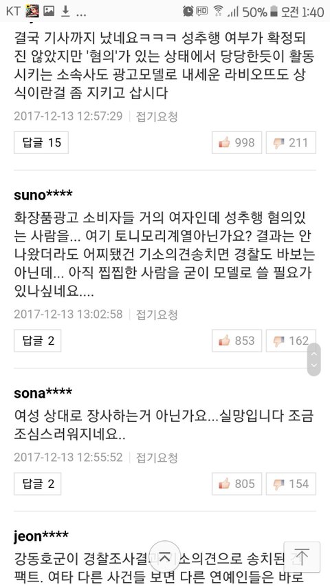 음... 미투운동을 보면서도 정말 '성추행 혐의로 기소의견 송치' 된 아이돌이 멀쩡히 활동하고 있는 부분에 문제점을 못느끼시는 분들이 있더라고. 그 부분은 다시 미투운동을 곱씹어보면서 생각해보길 바라고. 그리고 대중들이 모르는게 '강동호가 송치된 것을 개의치 않아서' 인지 '이미 뉴이스트를 충분히 걸러서' 인지 고민해보자. 프듀 막 끝났을 때 모두가 뉴이스트 응원하던 분위기는 끝났어. 일찍 동호가 활동중단 하고 단체활동을 자제했다면 '뉴이스트' 전체가 욕 먹고 걸러지는 일은 없었을 거라고 생각해.
