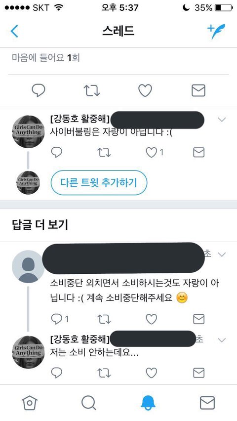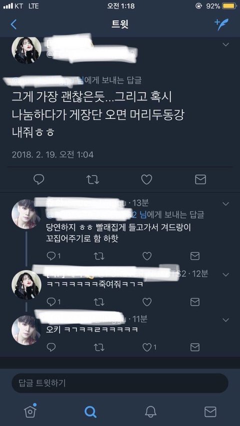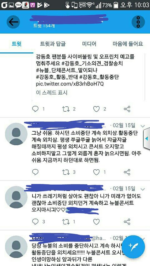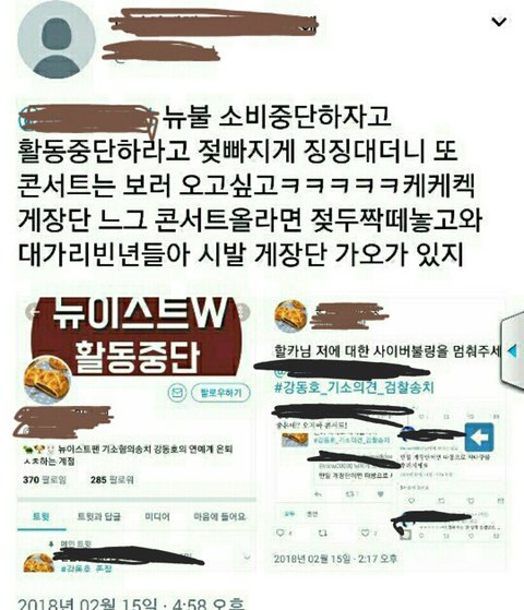 지금 짹에서 활동하는 몇 안되는 팬들은 뉴이스트 팬들의 사이버불링과 입막이 심해서 의견을 피력하기 어려운 상태야. '게장단'이라는 워딩을 통해서 조롱하고 불링하는데 이제 제발 좀 들었으면 좋겠어. 모르는건지, 모른 척하는 건지 모르겠지만 심각성을 알아줘. 아래는 나를 비롯한 활중단들이 당한 사이버불링이야. 심한 인신공격이나 오프불링(ㅋㅋ) 예고만 모았어. 내가 먼저 욕 했냐고 할 사람 있을거 같아서 미리 밝힐게. 나는 최대한 정중한 워딩을 사용하려고 노력했고 해시태그도 탈퇴나 인신공격이 들어가지 않은 '강동호_활동_반대' 혹은 '강동호_활중' 을 주로 이용했다는 걸 밝히고 싶어. 이 반응 속에서도 계속 활동 중단 요구하는 팬들이 아직도 안티같은지 궁금하네. 제발 이제 눈을 떠서 현실을 보자..