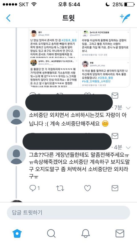1. 강동호 활동중단 요구하는 극소수 팬들은 '여성인권' 만이 아닌 '뉴이스트' 그룹 전체 이미지 하락을 막기 위해 활동 진행 중