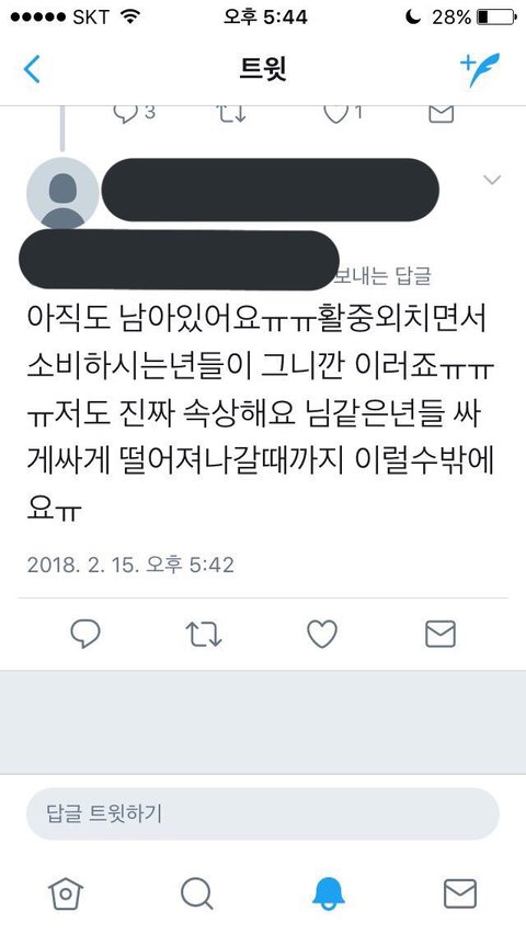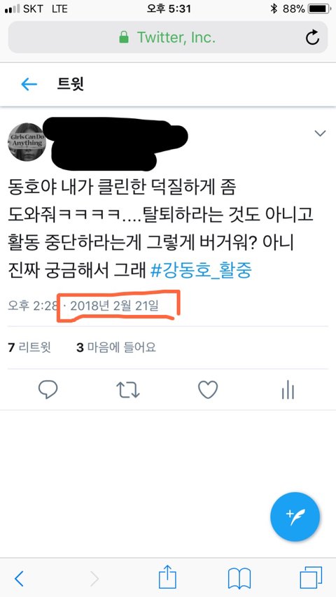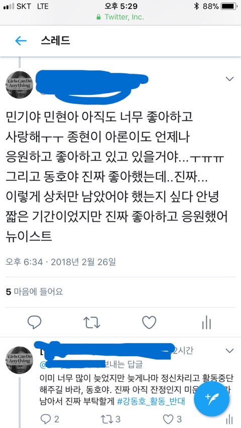 +++ 진짜 웃기긴 한데 내 개인 트위터 계정 관음해서 캡박하는거 어이없다. 그래도 나 하나 개인 계정 때문에 전체 의미 퇴색되는거 싫으니까 피드백할게. 나 아직 동호 좋아하는건 맞아. 내 계정 어디까지 읽었나 모르겠는데 탈퇴워딩 진짜 극히 일부야;; 진짜 힘들어서 죽고 싶을 때 한탄조로 올린 트윗으로 전체 의미 깎아내리려는거 좀 화난다. 내 스탠스 탈퇴랑 활중 사이에서 방황중인데, 결정 내리기 전에 탈덕하겠네. 증거로 내 트윗 몇 개 더 들고 왔으니까 내 사상검증 그만해. 그리고 계속 말했지만 활중단 스탠스 ㅈㄴ 다양하니까 머리채 좀 그만 잡아.