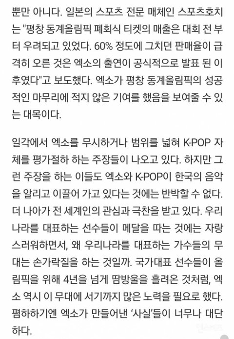 넷상에서 정치질 한다고 바뀌는건 전혀 없습니다. 이미 엑소와 씨엘은 공연을했고 많은 국가에게 찬사를 받고있네요. 이제 그만 힘빼주세요 먼저 섭외를 했든 거절을 했든 결국 30년 만에 국내에서 열린 올림픽에서 국가를 대표해서 공연을 한건 엑소와 씨엘입니다. 축하해주진 못할망정 "내가수가 하려던거 땜빵한거다" "내가수가 했어야 했다"등 무례한 발언은 그만 하시길