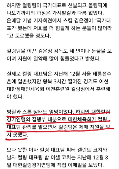 2. 하지만 컬링팀 내부상황은 좋지 못함. 선수들도 직접 지원을 못받았고 열악한 환경에서 훈련해왔다고 증언. 컬링물품들도 사비로 충당해야 할 정도였다고 함. 은메달 기자회견에서 외국인코치가 한국 컬링팀에게 지원좀 해달라고 호소.