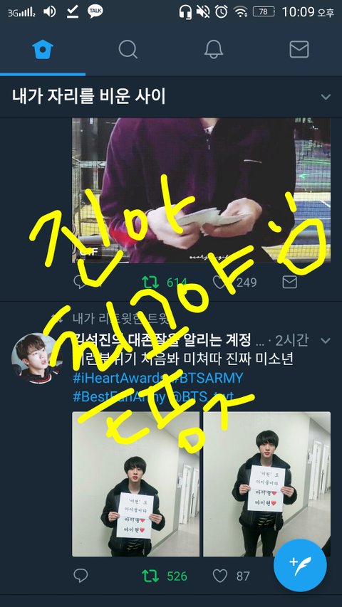 진이가 너무 잘생겼어..ㅠㅜ 아까 엄청 우울해있었는데 회복함ㅠ 오늘의 짤을 모으고싶당 아아아ㅏ아 첫화면부터 김석진 얼빡이라 행복했어ㅠㅠㅜㅜㅠ 보라색 벨벳 트레이닝복도 이쁘구 헤어밴드ㅠㅠㅠ 달방에서 오랜만에 머리 깐듯해서 심장 아파ㅠㅠㅠㅠ 정말 27살인게 믿겨지지않구.. 귀엽구 깜찍하구.. 달려라방탄 진짜 최고야 특히 자막 다시는 분 존경합니다.. 누가 날좀