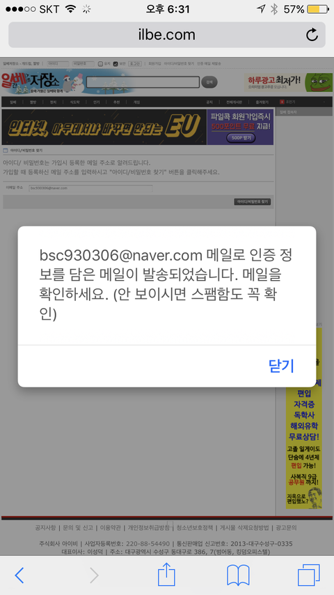 일베 아이디 찾기 들어가서 찬이 네이버 이메일이 면 가입되어있는걸로 나옴