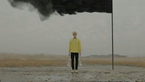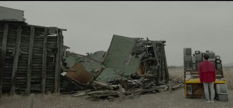 집이 사라져버리고 검은 연기가 피는 옛터에서 물을 들고있는 마크
