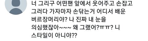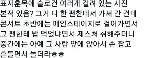 이 타이밍에 얼마전에 판에서 본 승리 명언 생각나네 팬들 이름 외울거면 다 외워야 되고 아니면 한 명도 안 외워야된다고 그래서 자기들은 몇번 봐서 아는 얼굴이라도 모르는척한다고ㅋㅋㅋ