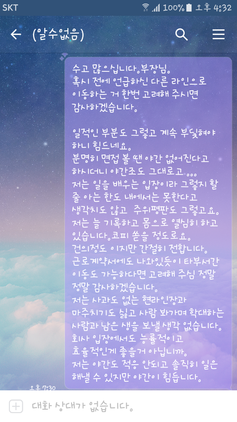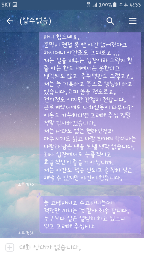 카톡 사진은 "제가 야간이 힘들어서 그만 두는 줄 알고 있을 당시"의 현장 상황이 반영 된 것이나