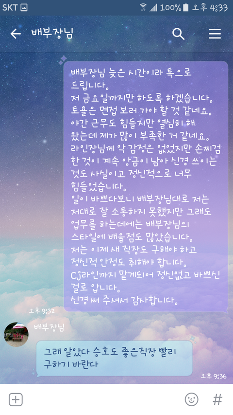 제 사직의 사유는 중요도를 표현 하자면 "야간<부장님의 거짓말<라인장의 손찌검(핵심)" 입니다.