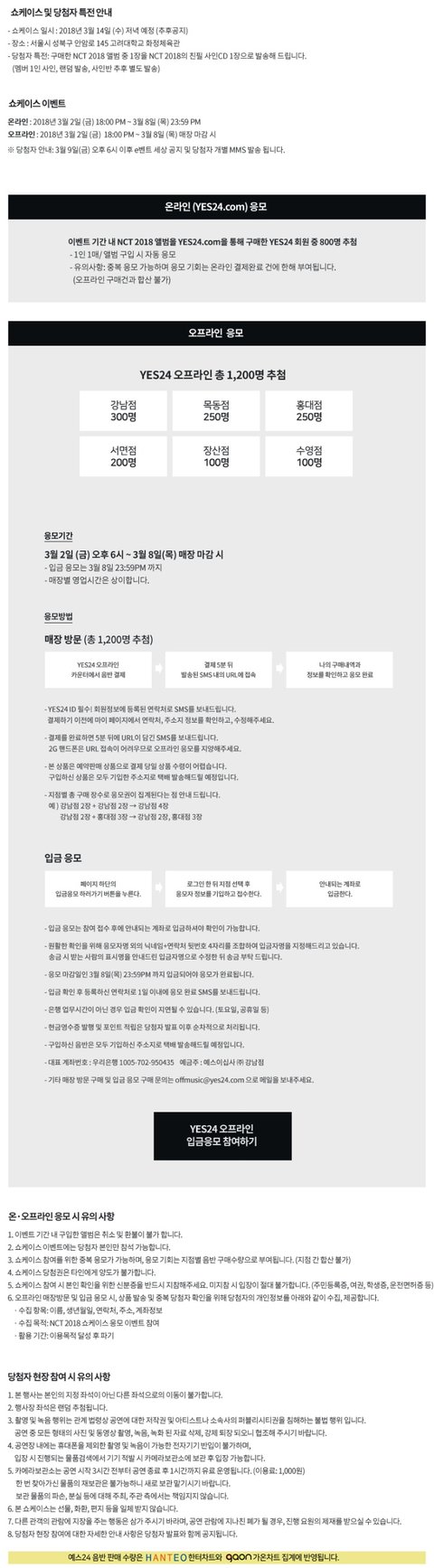 ▶ YES24 오프라인 입금응모 참여하기 : http://m.yes24.com/momo/mobileevent/ShowCase/180228NCT_payment_apply.aspx?NoMemYn=Y