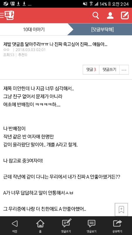 지 성격이 이기적이여서 지가 힘든거라는 댓글 있던데 조카인정~~저 글쓴아 마인드 좀 바꿔 이기적인련아