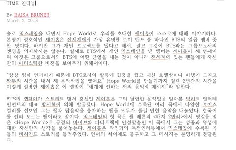 근데 오늘 네이버에서 제이홉이 TIME(타임지)랑 인터뷰했단 기사 보고 혹시나 해서 트위터에 검색해봤는데 역시나 전체 기사 해석해놓은 번역본이 있어서 공유하려고 올려.