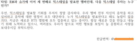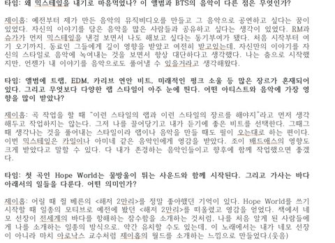 빌보드나 다른 음악잡지가 방탄소년단 다룬 기사는 많이 보여도타임지 같은 세계 1위 시사잡지가 그냥 기사도 아니고 인터뷰까지 해서 믹스테잎 리뷰를 상세하게 해준건 진짜 대단한 일 같아서 올리니까또 팬톡 가라 뭐라 하지 말고.