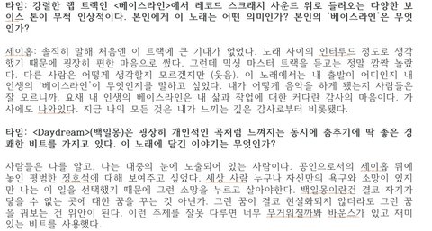국내 기자들도 이만큼만 준비해서 인터뷰해 주면 얼마나 좋냐. 이건 발매한지 하루만에 노래 다 들어보고 이정도 리서치해서 인터뷰하는 기자도 리스펙.