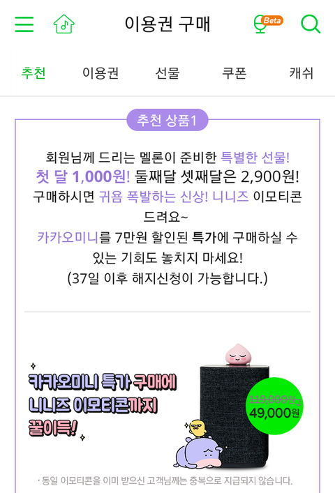 맬론 이벵중이야 이용권 1000원으로 구매할수있다